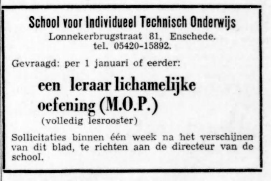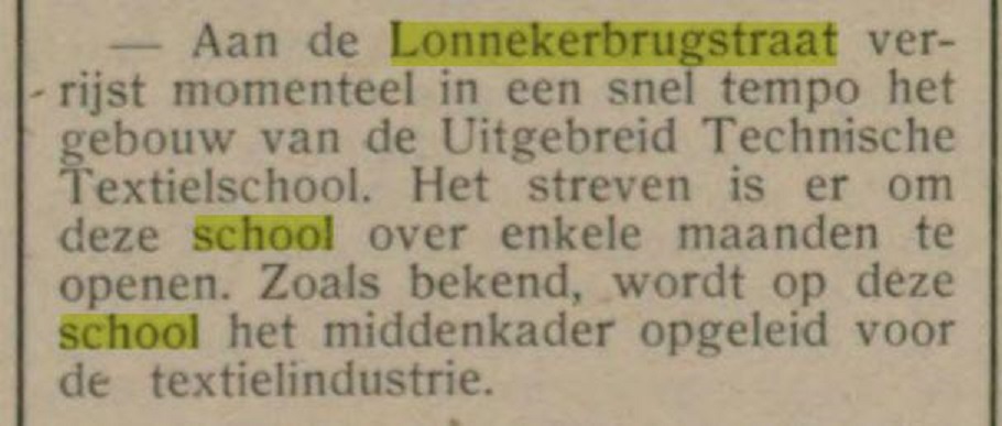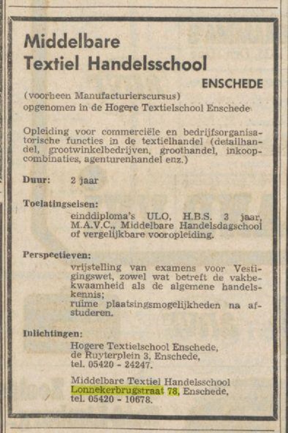 Aan de Lonnekerbrugstraat werd er vroeger ook onderwijs genoten. Volgens onderstaand artikel uit het Gereformeerd gezinsblad van 30-1-1957 was daar de Uitgebreid Technische Textielschool. Zie ook het bericht in Het Parool van 18-3-1969 waaruit blijkt dat deze school was gevestigd aan de Lonnekerbrugstraat 78. In de advertentie uit het Parool van 9-3-1968 wordt ook de Middelbare Textiel Handelsschool aan de Lonnekerbrugstraat 78 genoemd. In de Telegraaf van 11-9-1968 staat nog een advertentie van de School voor Individueel Technisch Onderwijs aan de Lonnekerbrugstraat 81. Ook in de voormalige Rijkswerkplaats aan de Lonnekerbrugstraat werd onderwijs verricht.