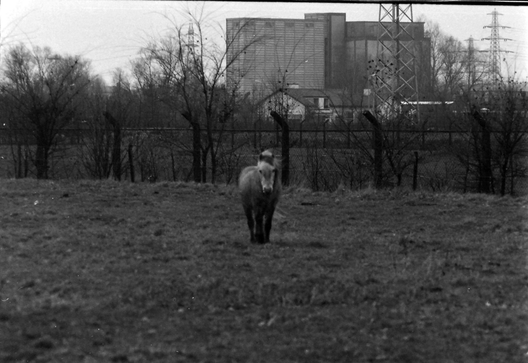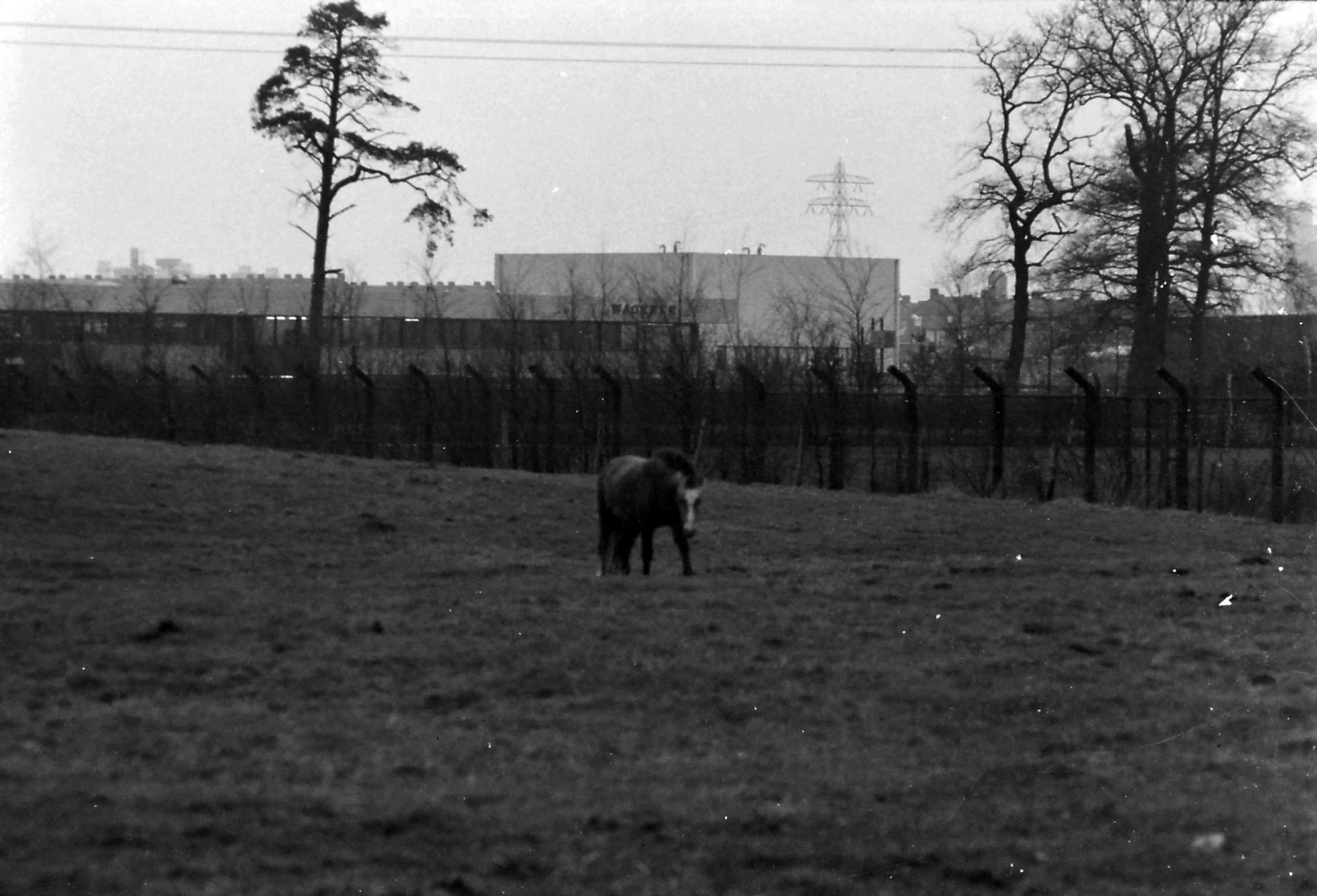 Ook deze foto is uit ongeveer 1970. Genomen vanaf de Bruggertstraat net westelijk van het Bonhoeffer (toen nog Ichthus) College. Met een 85 mm portretlens. Over de sportvelden van de school, over het spoor, naar de hoek van de H. ter Kuilestraat en de Binnenhaven.