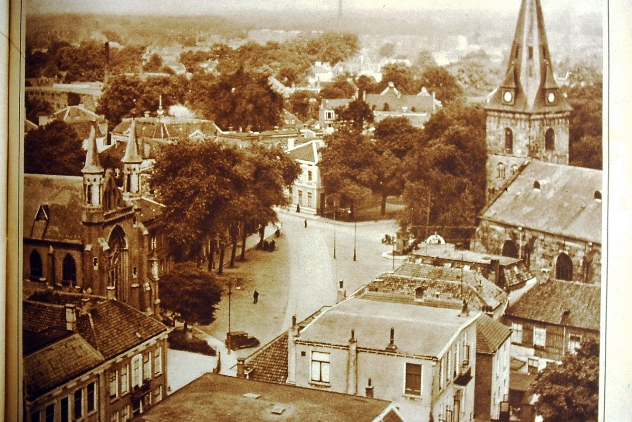 Markt vanuit stadhuistoren met oude en nieuwe Jacobuskerk en vroegere villa Cromhoff op de hoek van de Markstraat.