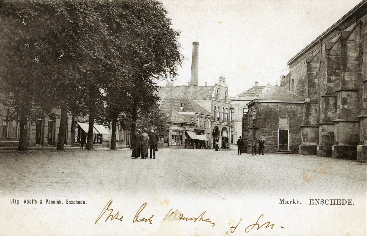 Markt Rechts de Jacobs kerk of ook wel de grote kerk met op de achtergrond de fabrieksschoorsteen van Menko daar waar nu de Irene promenade is..jpg