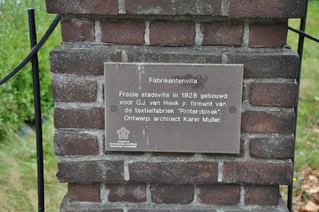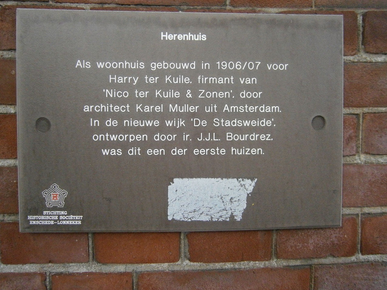 Monumentenbord nr. 6 van de lijst. De stadsvilla Ter Kuile aan de Piet Heinstraat 1 hoek M.H. Tromplaan waarin vroeger ook de ESV (Enschedese School Vereniging) heeft gezeten.
