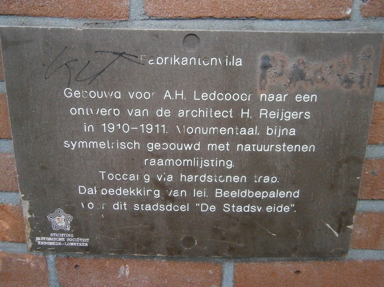 Monumentenbord nr. 12 van de lijst. Ripperdastraat 8 villa Ledeboer ook wel villa Stadsweide genoemd.