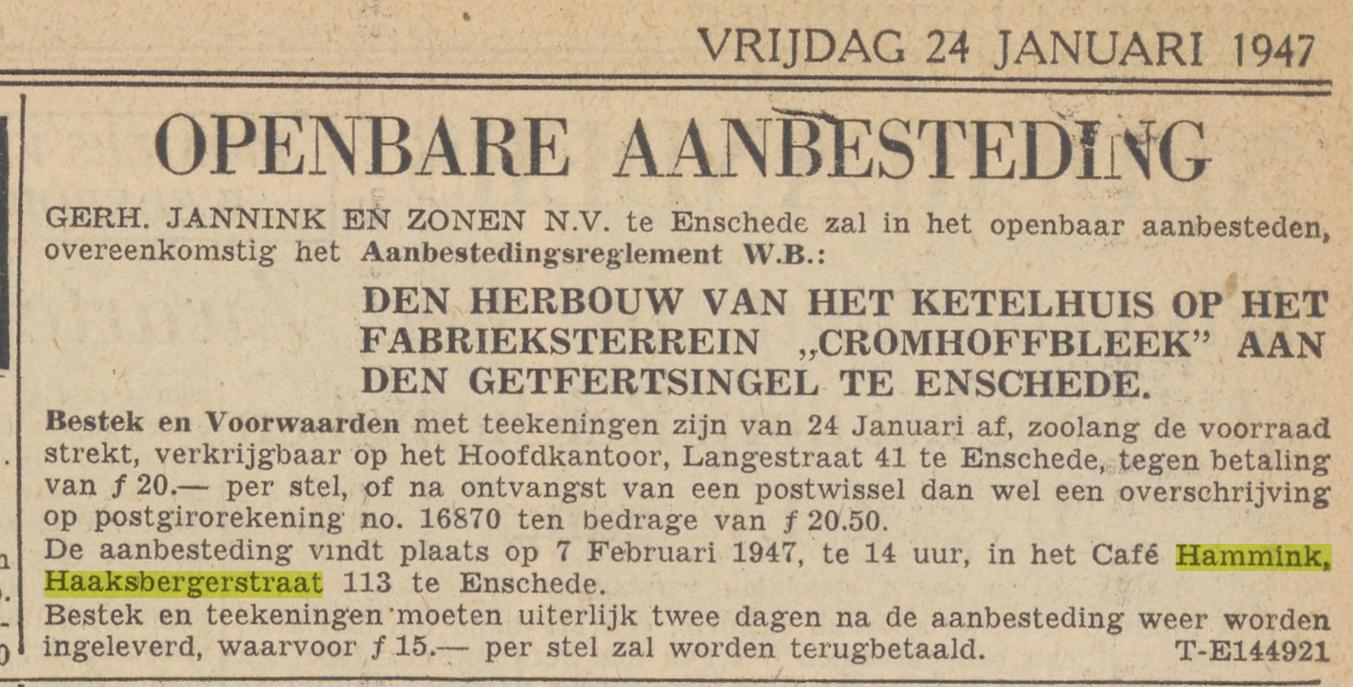 Na het bombardement van 22-2-1944 is cafe restaurant Hammink verplaatst naar een houten noodvoorziening aan de Haaksbergerstraat 161 (oude nummering 113) hoek Broekheurnerweg 2. zie bijgaande krantenberichten uit de Tubantia van 5-1-1962 en 20-4-1962.