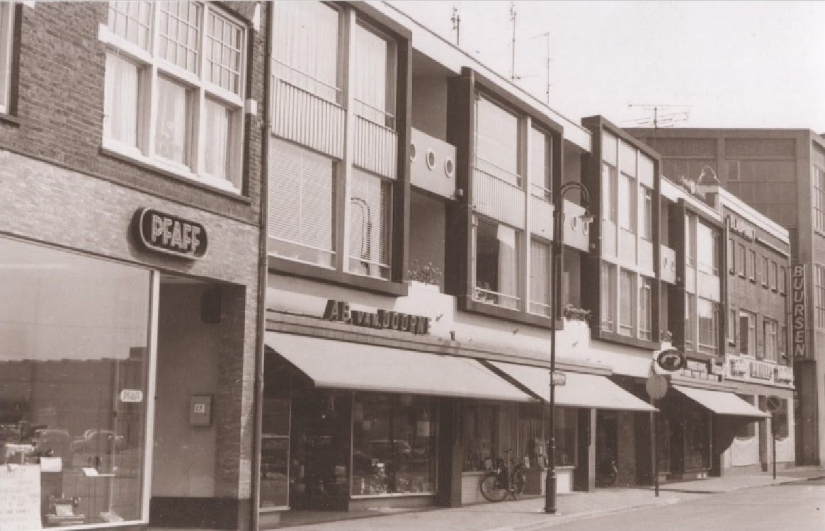 Kalanderstraat 19  . naaimachinewinkel Schuring Pfaff , Ab van Doorne, modehuis Vaartjes, en Radio Televisie Buursen 1967.jpg