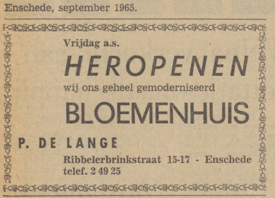 Ribbelerbrinkstraat 15-17 Bloemenhuis P. de Lange advertentie Tubantia 15-9-1965.