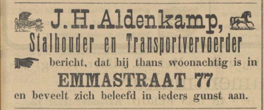 Emmastraat 77 J.H. Aldenkamp Stalhouder en Transportvervoerder advertentie Tubantia 18-4-1908