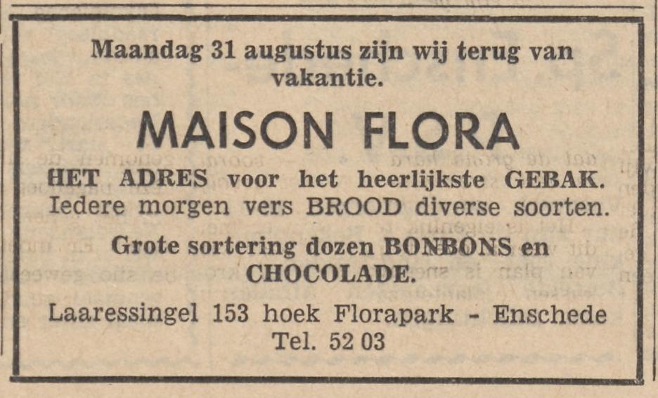 Laaressingel 153 hoek Florapark Maison Flora gebak advertentie Tubantia 29-8-1964