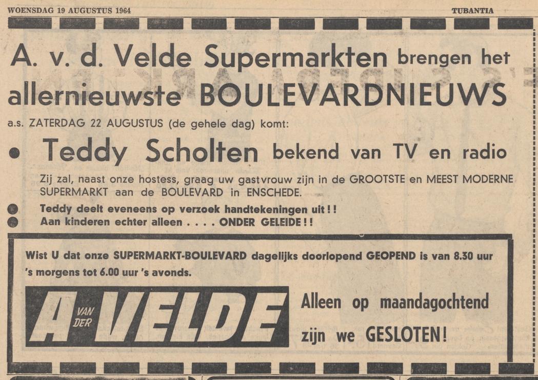 Boulevard 1945-335 Supermarkt A. van der Velde advertentie Tubantia 19-8-1964.