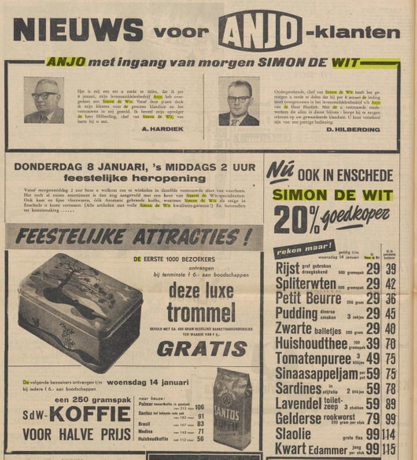 Minkmaatstraat 134 supermarkt Simon de Wit voorheen Anjo advertentie Tubantia 7-1-1959 en krantenbericht 6-1-1959.