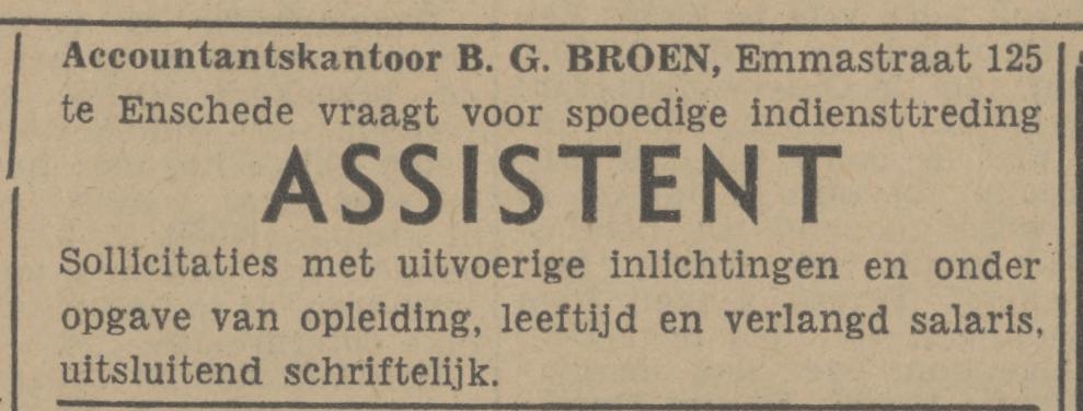 Accoutantskantoor Broen, B.G. Leraar Boekhouden M.O. Emmastraat 125.