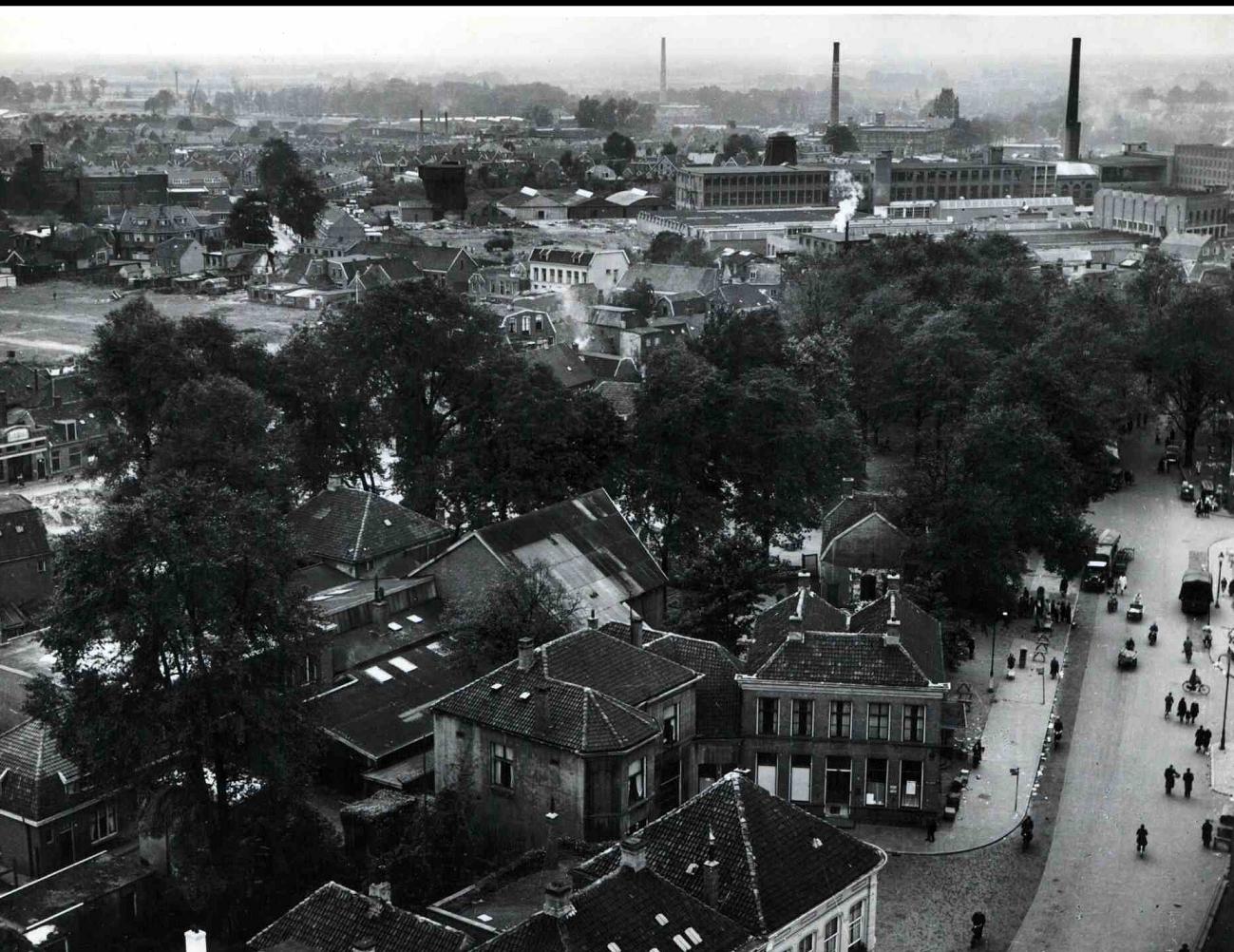 Beschrijving: Links van Loenshof(voormalig) en voormalig H.J. van Heekplein. Achtergrond textielfabriek J.F. Scholten en Zn.