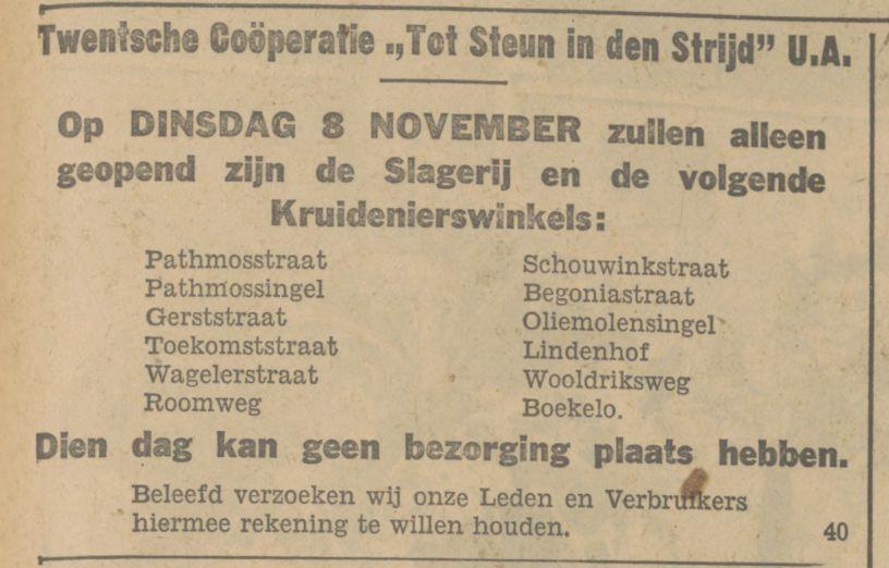 Ook was er nog een broodfabriek aan de Zuiderspoorstraat 31 en verder nog een aantal Cooperatie winkels (slagerij en kruidenierswinkels) op diverse adressen in Enschede, o.m. de Oliemolensingel. Zie ook onderstaande advertentie in Tubantia van 4-11-1932.