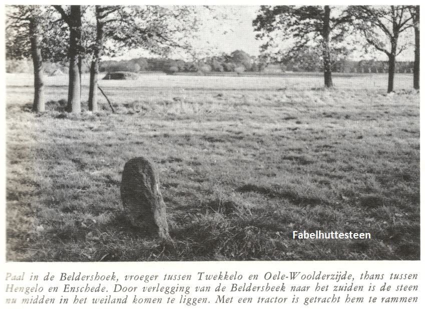 De onderstaande foto uit Jaarboek Twente 19701 is de Fabelhuttesteen. Rijksmonument 46595 wordt ten onrechte Belderspaal genoemd; net als de foto hieronder is de Fabelhuttesteen bedoeld. De in het monumentenregister vermelde lokatie is voor geen van beide stenen correct; de Fabelhuttesteen staat 200 meter verderop. bron: http://www.markegrenzen.nl/markestenen/belderspaal/