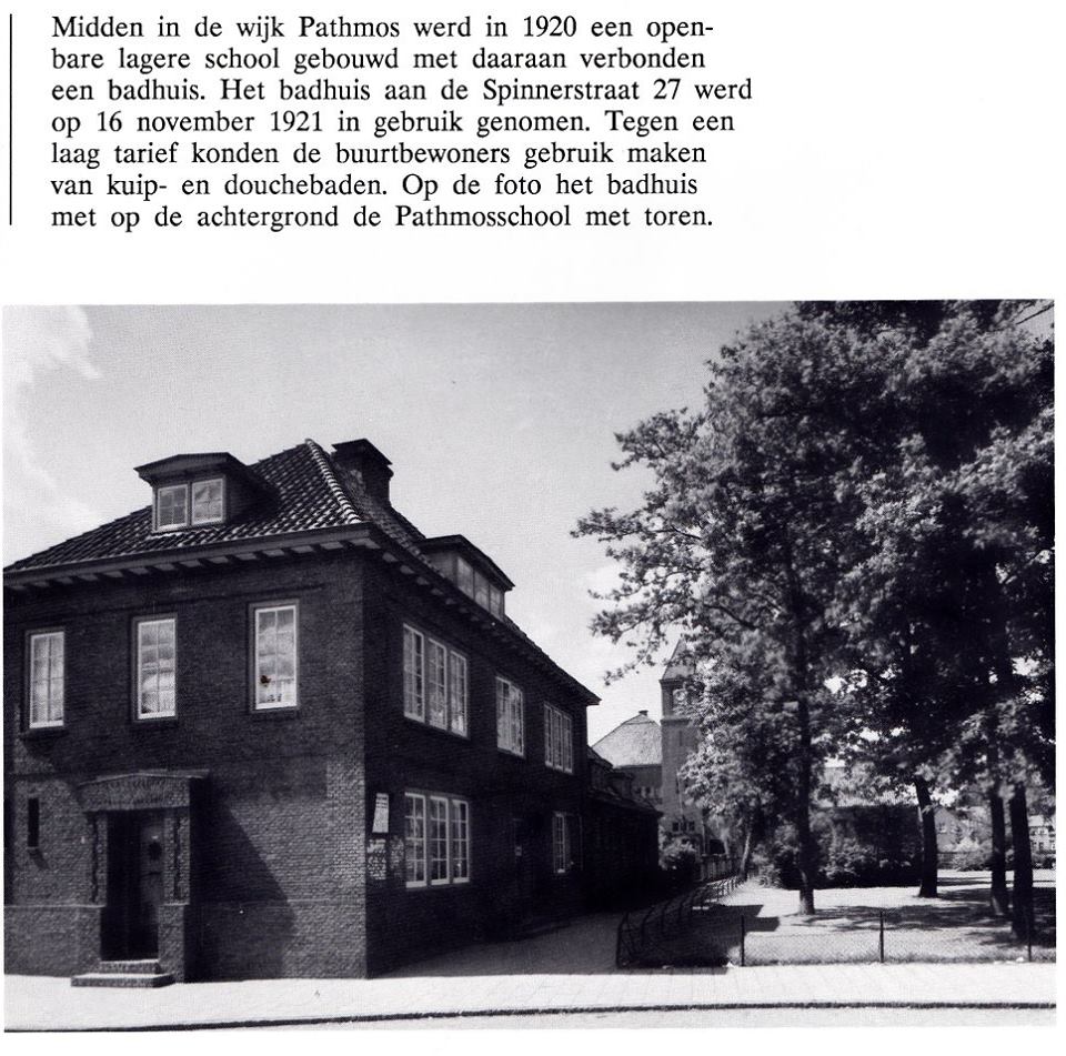 Het badhuis is tussen 1915 en 1920 gebouwd. Het voormalige badhuis is een gemeentelijk monument. Aangezien de arbeiderswoningen in de wijk Pathmos in de eerste helft van 1900 niet over een douche of bad beschikten werd het badhuis intensief gebruikt. In de vijftiger jaren was het een goede gewoonte om op vrijdag een wasbeurt te nemen. Dat gebeurde voor kinderen thuis in een wasteil en de grotere kinderen en volwassenen gingen naar het badhuis tot het begin van de zestiger jaren.