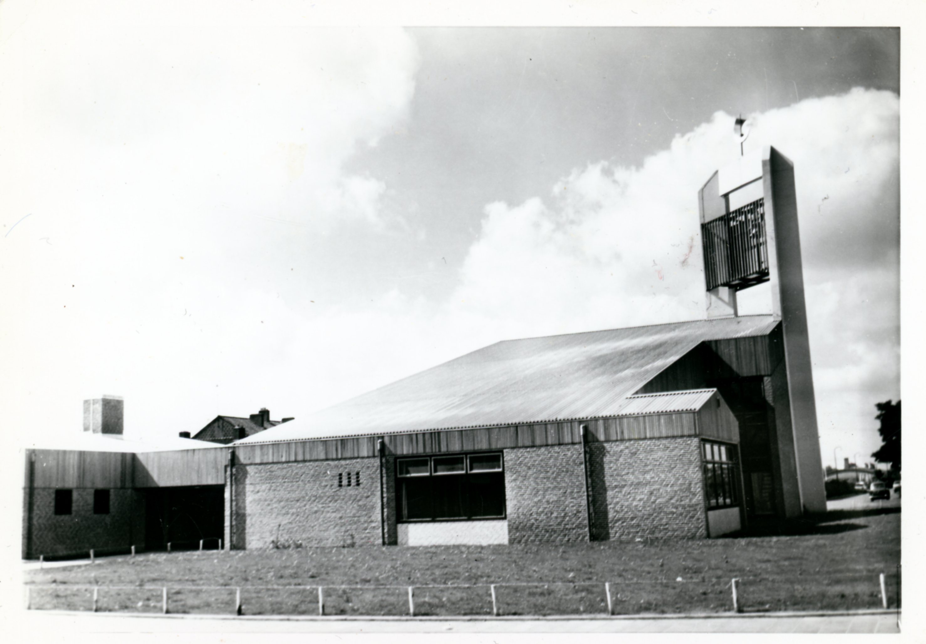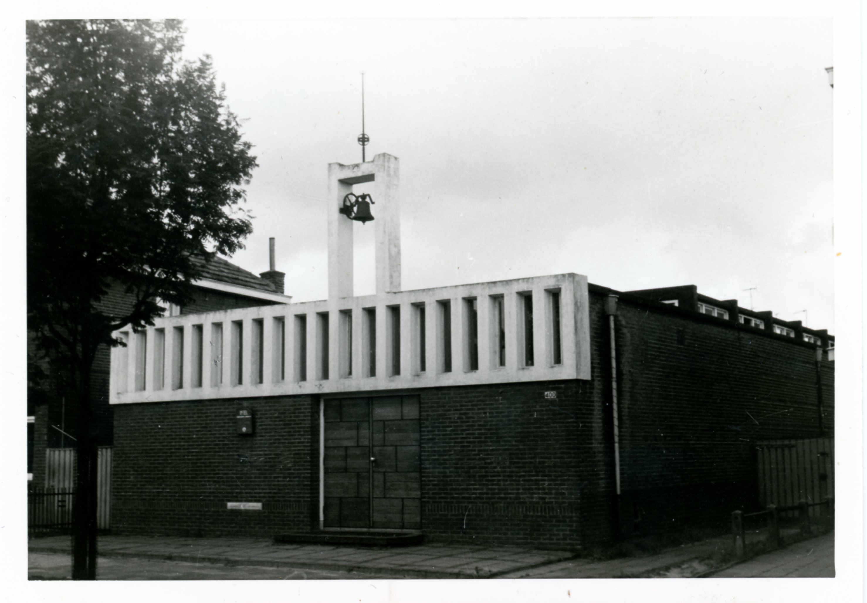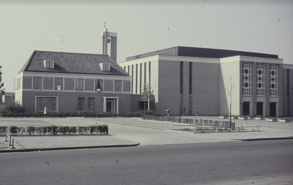 R.K. Michaëlkerk met links daarvan de pastorie. N.B. De kerk is in 1962 in gebruik genomen, in 2005 verkocht en in 2008 afgebroken..jpg