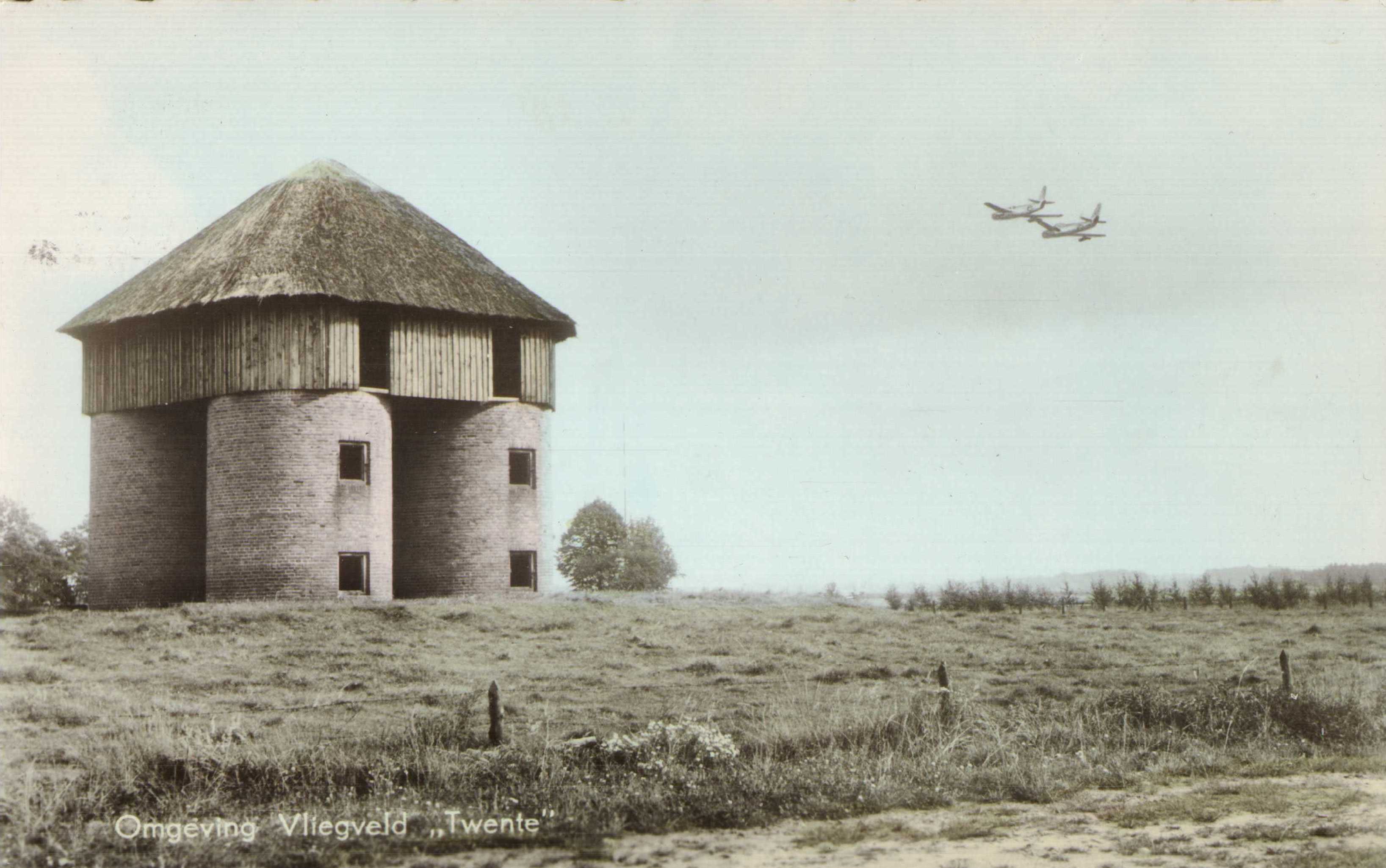 "De door U meegezonden 'onbekende' foto (ansicht) ken ik als zwart-wit exemplaar uit onze collecties, en geeft de opslagloodsen voor ruwvoer weer zoals deze tot ca. 1965 hebben gestaan aan de Korhaanweg aan de rand van de vliegbasis Twenthe.De constructie werd in 1941 in opdracht van de Duitse bezetter gebouwd als onderdeel van hun eerste Landwirtschaft (boerderij) en om camouflage-trechnische redenen van een strooien dak. De huidige opstallen van de voormalige mestdrogerij behoorde destijds tevens tot dit complex."