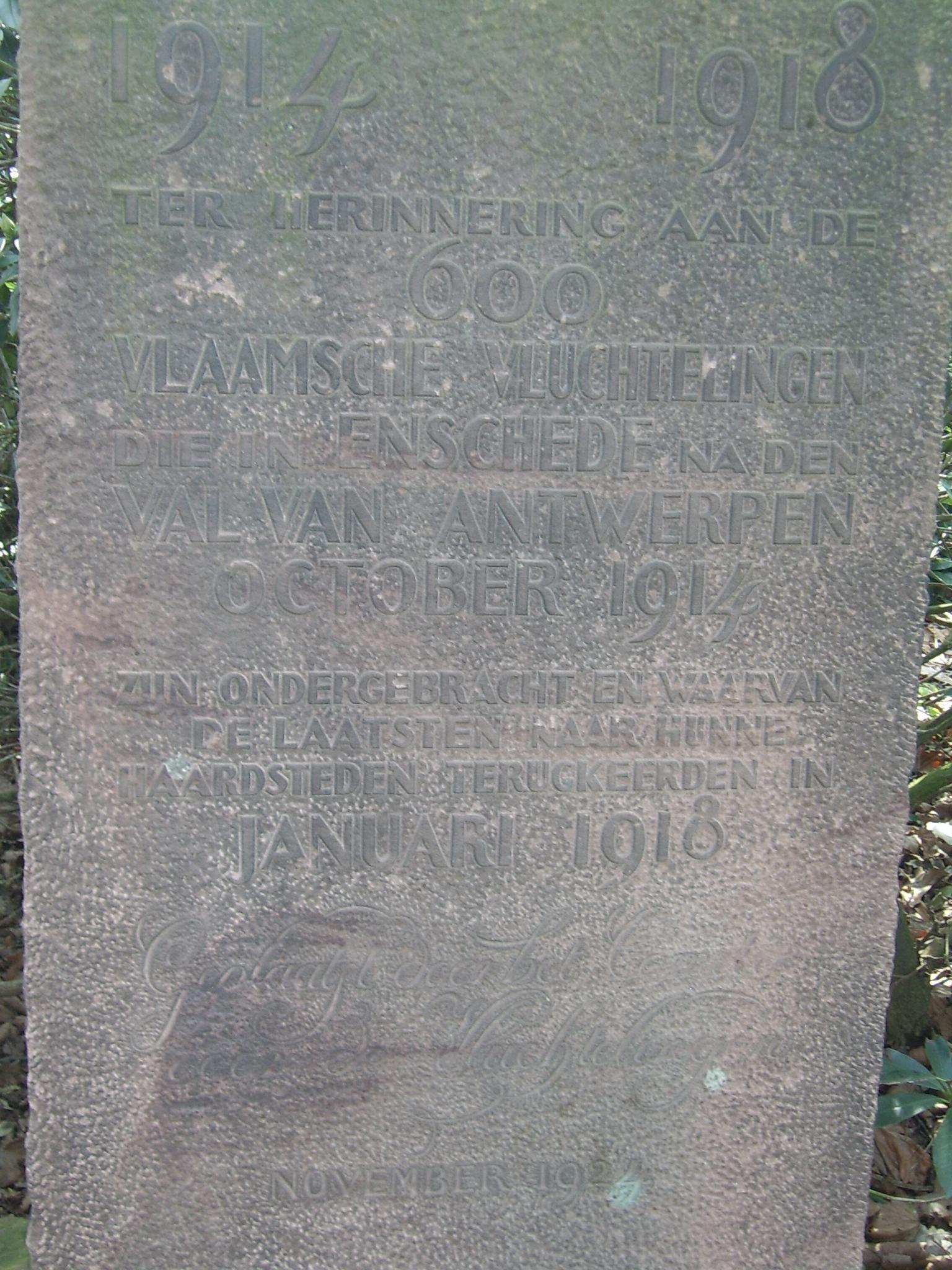 Ter herinnering aan de 600 Vlaamsche vluchtelingen die in Enschede, na de val van Antwerpen in october 1914, zijn ondergebracht en waarvan de laasten naar hunne haarsteden terugkeerden in januari 1918.
