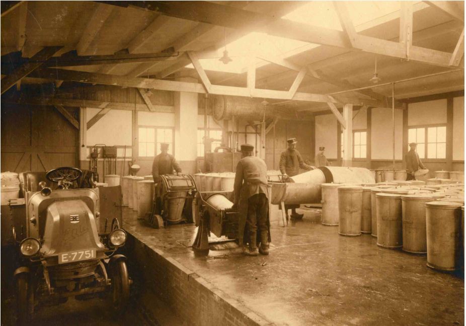 De gemeentereiniging in Enschede beschikte op een terrein aan de Poolmansweg op het Bruggert over een gebouw waar de huisvuiltonnen gereinigd werden. Alle gezinnen konden voor f 6 per jaar over zo’n ton beschikken. In 1923 werd voor het ophalen van het huisvuil een tonnenwagen aangeschaft, waarmee Enschede een grootse primeur had voor Nederland. De schoongespoelde tonnen werden ingeladen op de tonnenwagen, waarna begonnen werd aan een volgende route door de straten van Enschede. De volle tonnen werden dan direct vervangen. Dit gebeurde twee keer per week. Om dit vuilnisophaalsysteem in de rest van het land te kunnen propageren werd en een serie foto’s gemaakt.