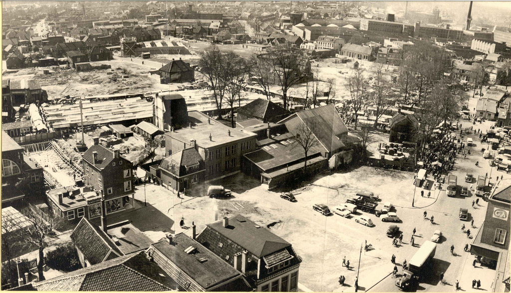 Dat is een mooie overzichtsfoto Veteraan. Genomen vanaf de stadhuistoren. Wat is er gigantisch veel afgebroken in de jaren 50. Waarschijnlijk een veelvoud van wat de bombardementen wegvaagden. Duidelijk is hier te zien wat in dat deel de eerste nieuwbouw was. De zaak op de hoek van de toen nieuwe Raadhuisstraat en Achter t'Hofje. Er zat toen een stoffenzaak in. Duidelijk is ook te zien dat er naast aan de fundering wordt gewerkt van andere winkelpanden aan de Raadhuisstraat. Verder alleen nog in de verte de nieuwbouw van Garage van de Brand. Dat gebouw staat al jaren leeg en bevindt zich naast de zijvleugel van het postkantoor. De eerste aanzet van wat de Mooienhofstaat moest worden.