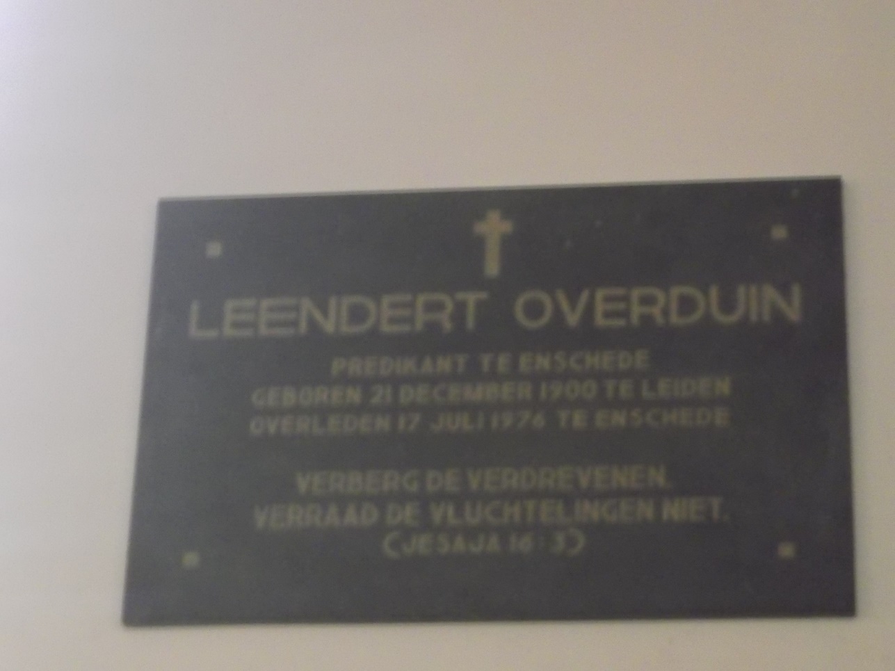 Nog weer een oorlogsmonument gevonden en wel in de Grote Kerk aan de Oude Markt. Het is een plaquette van Ds. Leendert Overduin (1900-1976). In december 2000 werd in de Grote Kerk op de Oude Markt deze gedenksteen geplaatst als herinnering aan zijn moed, inzet en geloof. zie ook: http://4en5mei.enschede.nl/archief/0002 ... &monument=