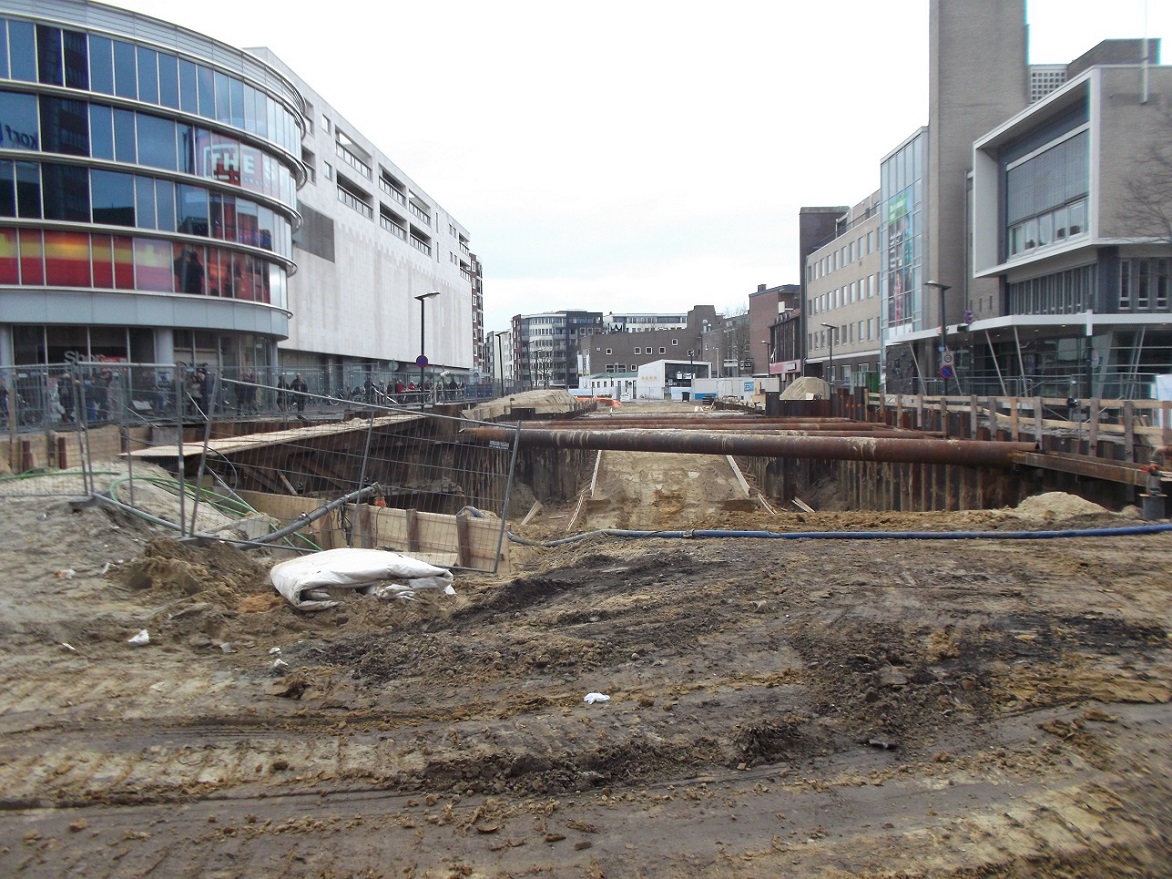 Alle voorbereidingen worden getroffen om over een paar weken te kunnen beginnen met het slaan van damwanden voor de nieuwe inrit naar de Van Heekgarage. Tientallen leidingen moeten worden omgelegd. De waterputten voor de fontein op het Van Heekplein moeten worden verplaatst. Een brede strook grond in de Mooienhof tussen de Edo Bergsmalaan en de Bijenkorf moet helemaal vrij worden gemaakt van alle obstakels.