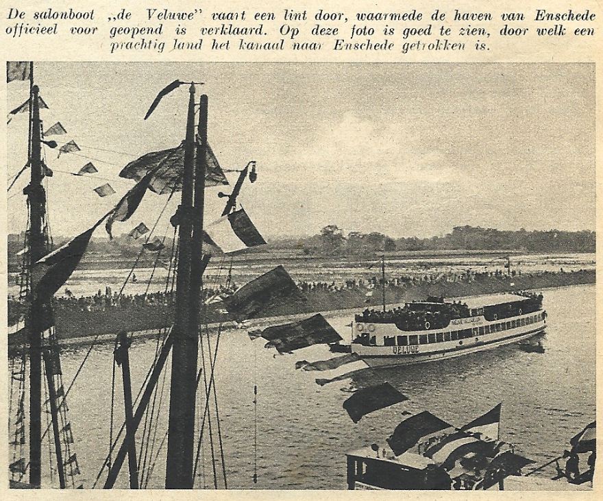 De salonboot 'de Veluwe' vaart een lint door, waarmede de haven van Enschede officieel voor geopend is verklaard.