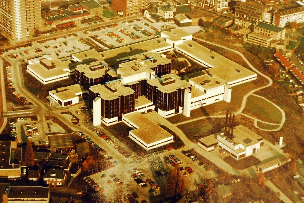 Toch ziet het ziekenhuis op deze foto er wel mooi en modern uit, vooral vergeleken met de bebouwing eromheen. Grappig in vergelijking met hoe het er nu uitziet in contrast met het nieuwe ziekenhuis. Doet je afvragen wanneer deze nieuwbouw weer gedateerd zal zijn.