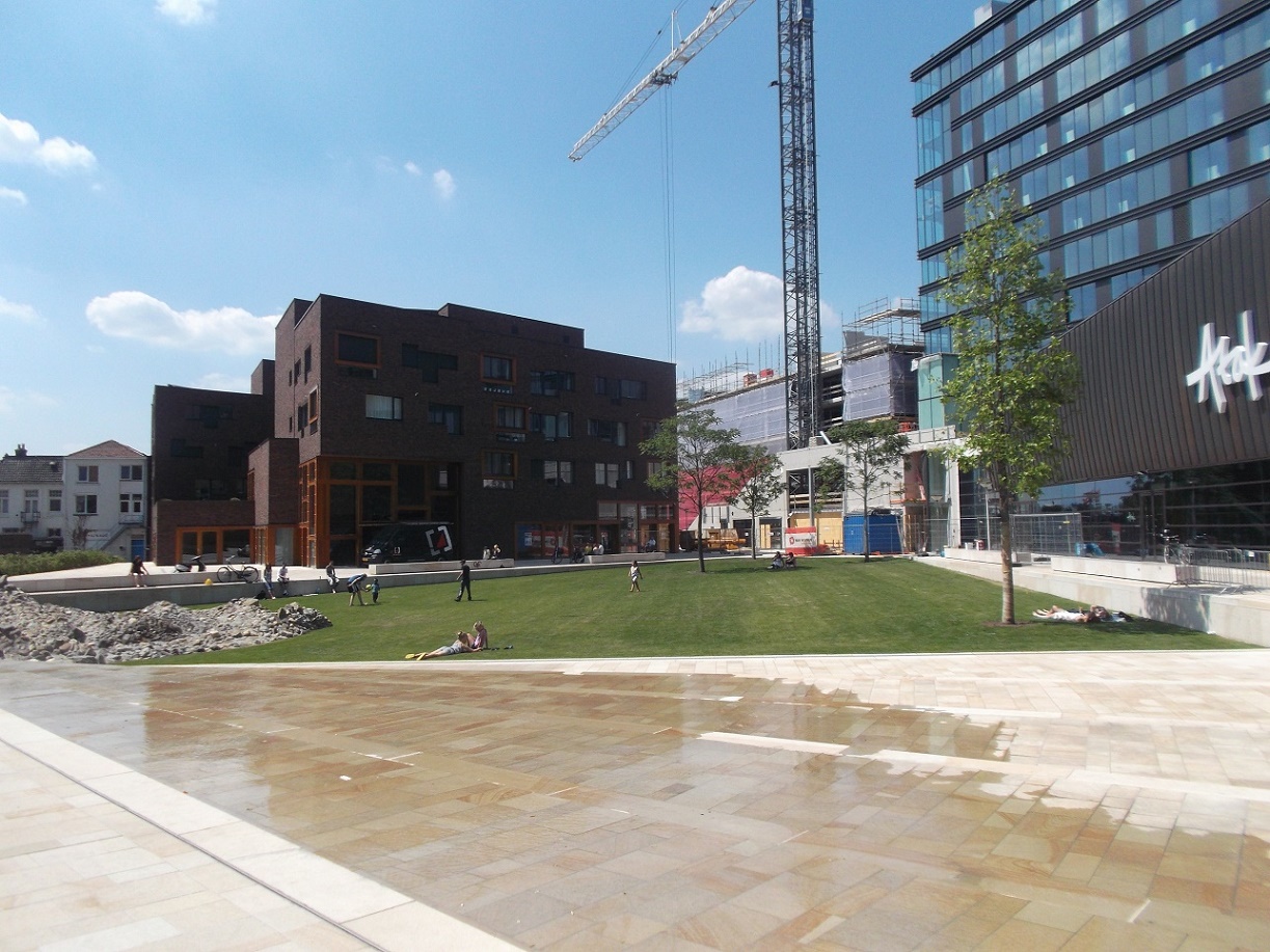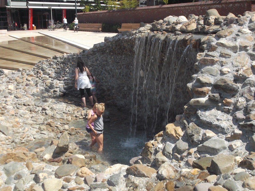 Het was vanmiddag gezellig toeven rond het nieuwe Willem Wilminkplein en het watervalletje werkt ook weer.