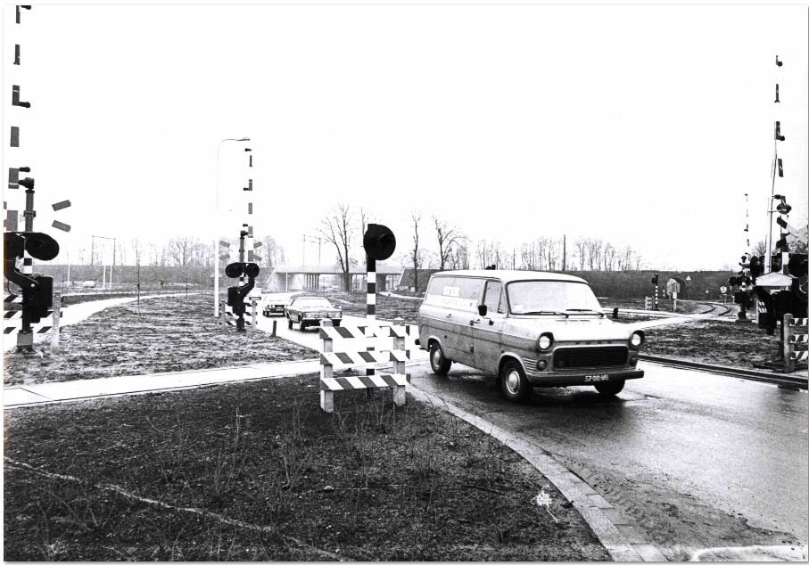 overweg parkweg met op de achtergrond het Bouwhuistunneltje en de overwachwegwachteres