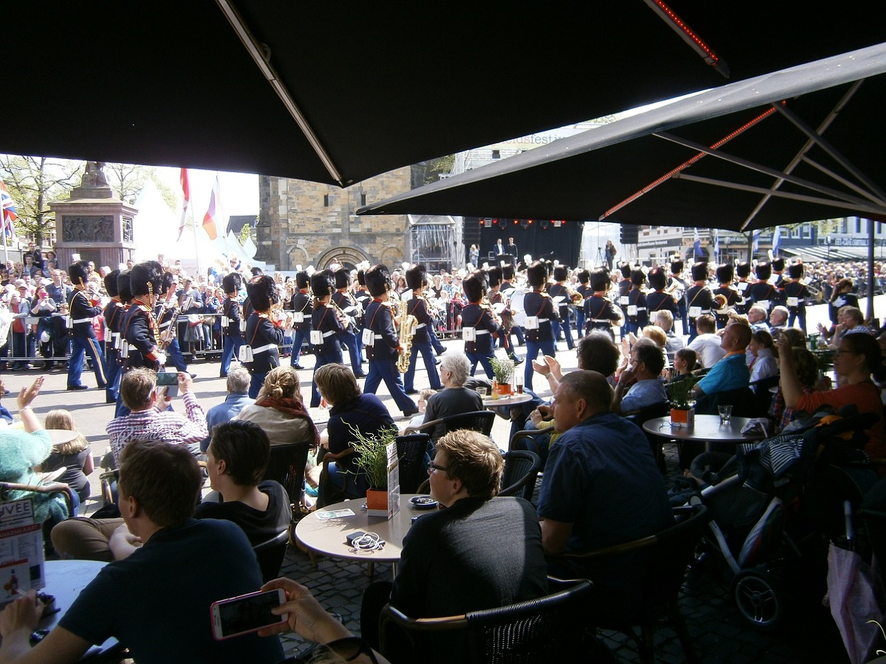 Rechts staan soldaten en links tegen het stadhuis aan staat er een die zijn arm uitsteekt
