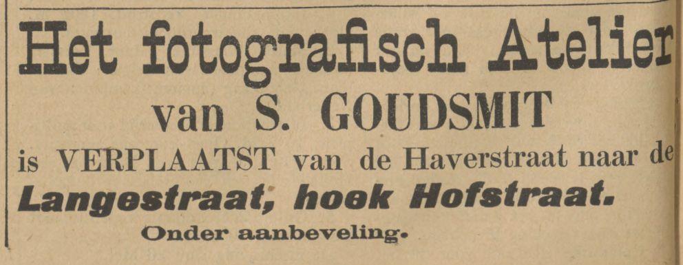 Op nr. 247 van de Achterstraat was ook een fotografisch atelier van Salomon Goudsmit. Van deze fotograaf is ook een foto opgenomen in de beeldbank van het gemeentearchief (zie onderstaande foto). Het betreft een foto van een versierde poort gemaakt ter ere van koninklijk bezoek. Ik vraag mij af of deze foto wel in Enschede is gemaakt, omdat de fotograaf Goudsmit ook een atelier had in Groningen, zoals blijkt uit de onderkant van de foto en ook uit bijgaande advertenties.