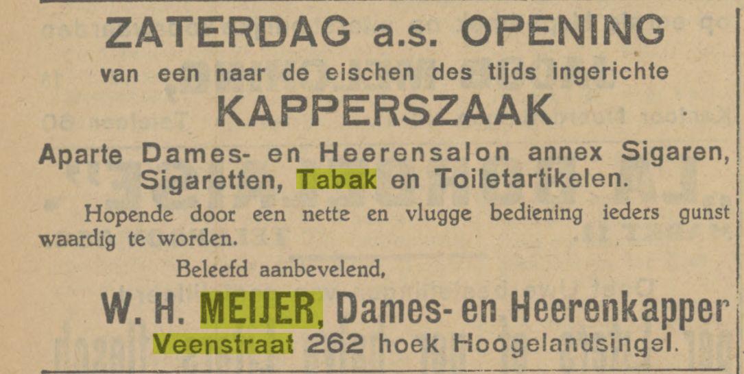 Veenstraat 262 hoek Hogelandsingel kapperszaak W.H. Meijer advertentie Tubantia 2-8-1929.
