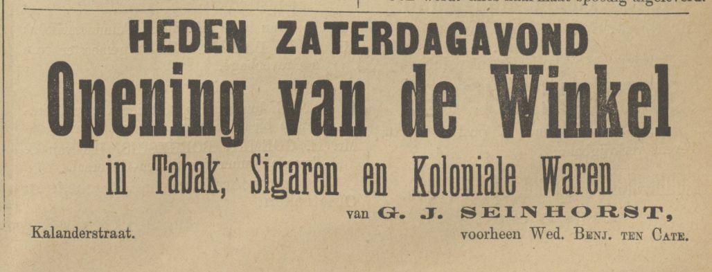 Kalanderstraat Seinhorst Tabak, Sigaren en Koloniale Waren advertentie Tubantia 15-6-1889.
