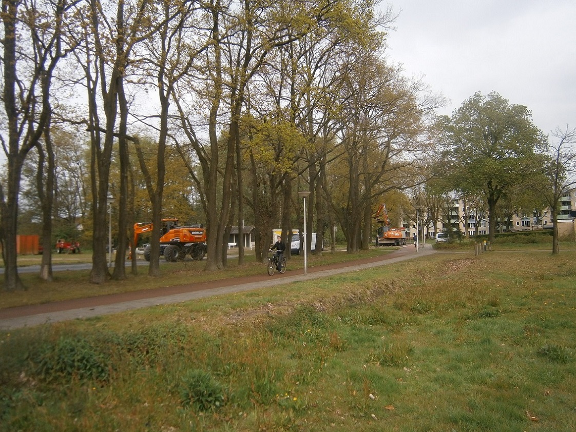 Vanmorgen is men begonnen met de aanleg van de fietsstraat aan de Ferdinand Bolstraat. Er wordt vanaf de rotonde Haaksbergerstraat een fietspad aangelegd, die gedeeltelijk door het weiland loopt en waar tot voor kort nog 2 ponypaardjes rondliepen. Ik hoop dat die pony's daar weer terugkomen en ook de bomen blijven staan.