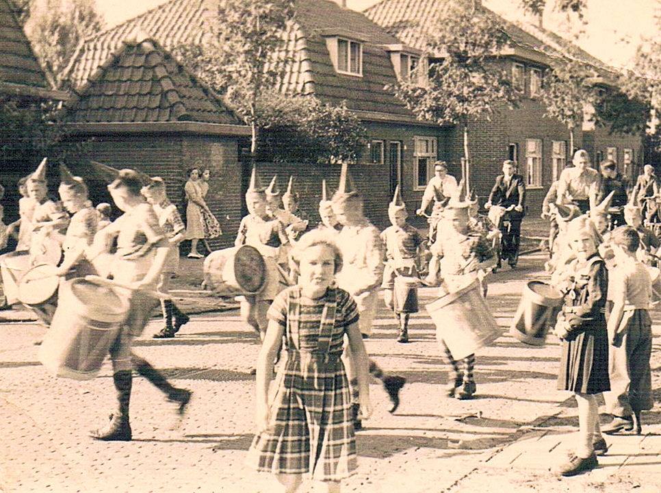 Stevenfennestraat hoek Boekweitstraat Drumband Stevenfenne omstreeks 1956-57.jpg