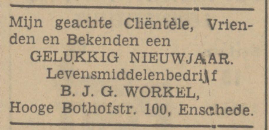 Hoge Bothofstraat 100 Levensmiddelenbedrijf B.J.G. Workel advertentie Tubantia 31-12-1941.