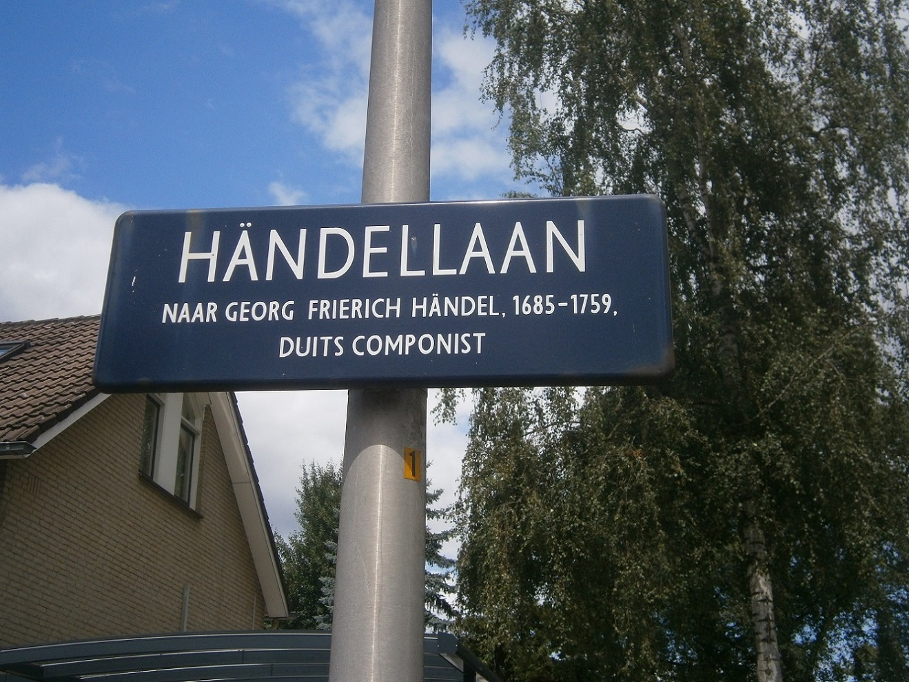 Naar Georg Friedrich Händel, geboren 23 februari 1685 te Halle, overleden 14 april 1759 te Londen. Duits componist van een groot aantal werken, w.o. opera's en oratoriua; enkele van zijn composities zijn: The messiah, Watermusic, Saul, Israël in Egypt, het Utrechtse te Deum etc. Hij verwierf in 1726 de Engelse nationaliteit (12 december 1960). bron: http://straatnamen.enschede.nl/straten/00378/?char=H