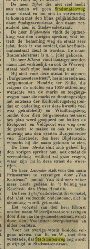 Naar het stadsgedeelte "De Stadsmaten" of "Stadsweide" (27 april 1899, gewijzigd 4 juni 1903). Door de aanleg van nieuwe straten in de Stadsweide bij besluit van 19 februari 1907 vervallen. bron: http://straatnamen.enschede.nl/archief/00311/?char=S