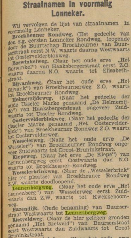 Naar het oude erve "Het Leunenberg" (29 mei 1936, gewijzigd 26 april 1971). Vervallen bij besluit van 6 november 1973). bron: http://straatnamen.enschede.nl/archief/00220/?char=L