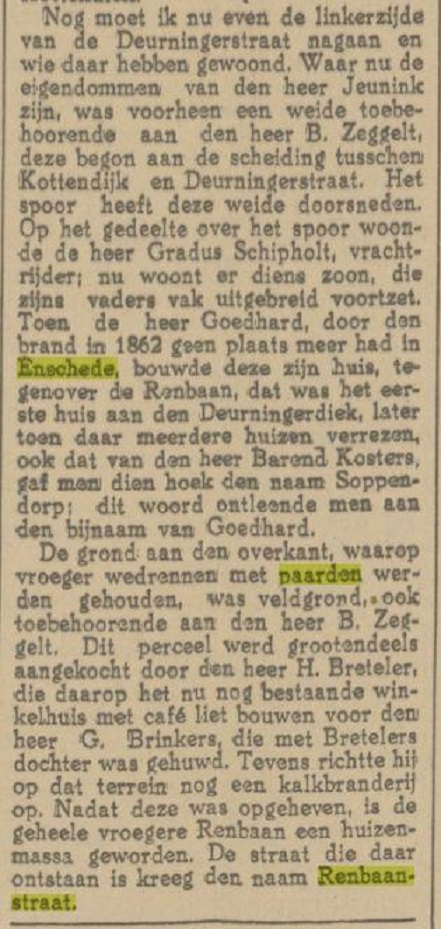 De Renbaanstraat loopt nu van de Roomweg eerst z.-waarts, daarna z.w.waarts tot de Deurningerstraat.