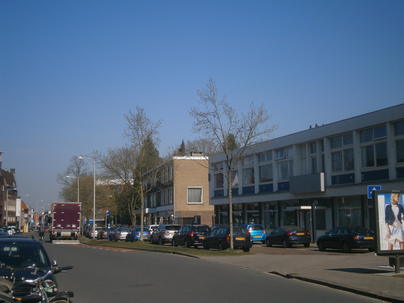 Deurningerstraat Rechts van T & M werden 8 panden gesloopt. De Hengelosedwarsstraat werd verlegd en omgedoopt in Raiffeisenstraat.  het T & M pand net rechts van het midden. Voorheen  schoenenwinkel Eenkhoorn.jpg