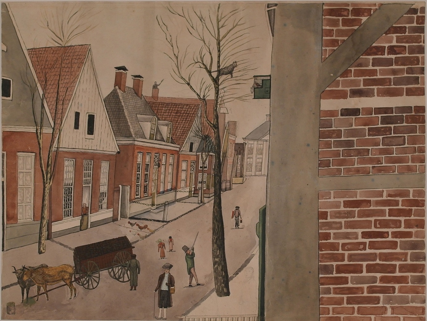 Aquarel De Langestraat te Enschede in 1840, gedeelte west-oost. vervaardiger W.J. Meyer.