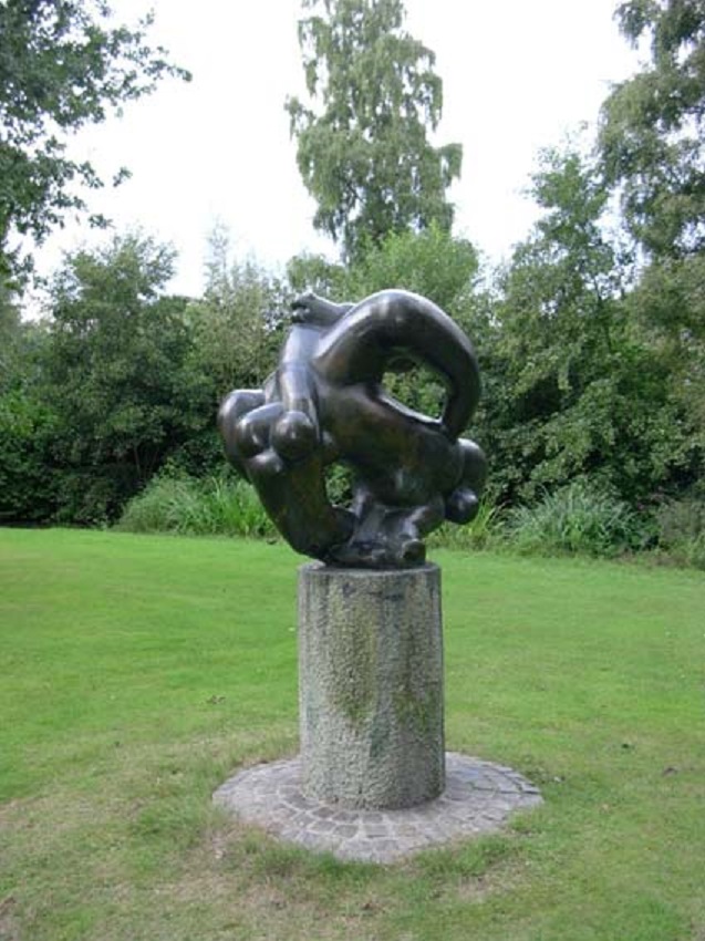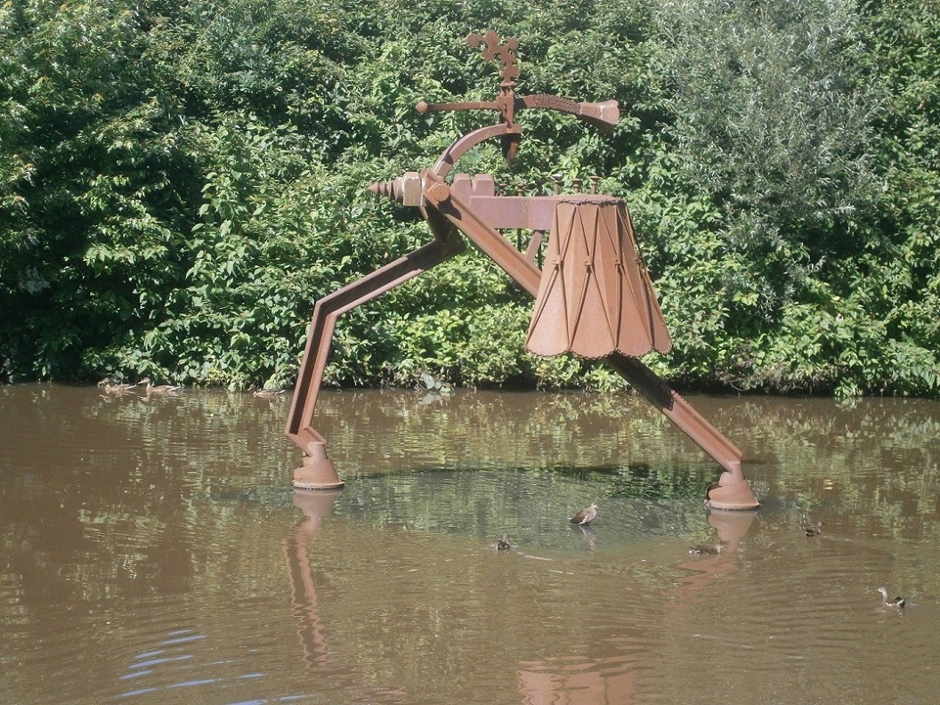 Belgiëlaan, thv de Beneluxlaan kunstwerk De Zandloper, tweebenige figuur in vijver. Beeld van kunstenaar Colin Wilkinson.