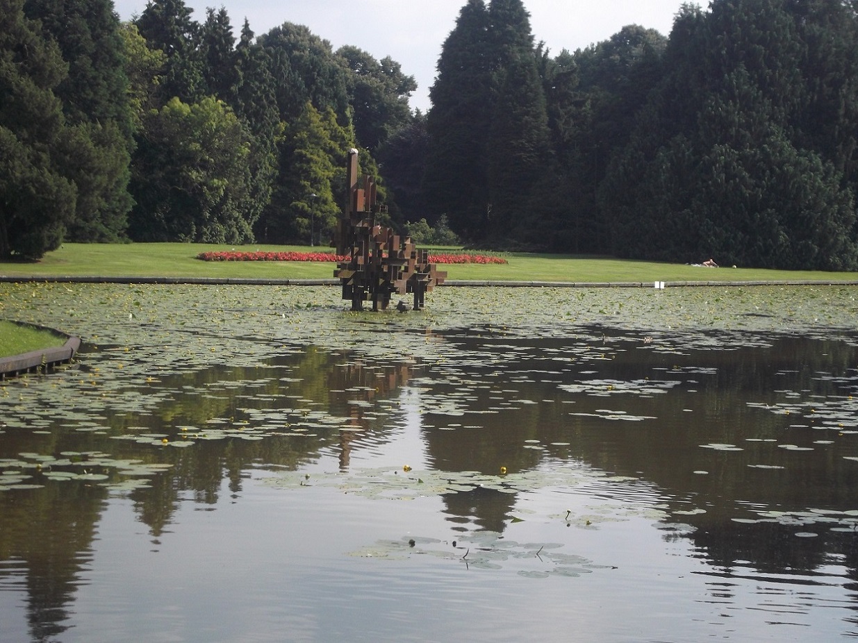 Parkweg, thv de Stadsmatenstraat Volkspark vijver kunstwerk DIN 20 van kunstenaar Andre Volten. Dit kunstwerk stond vroeger aan de Fazantstraat.