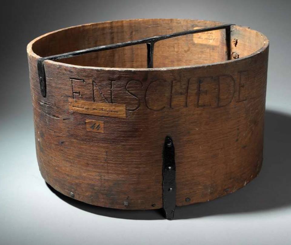 Schepel met opschrift Enschede. Een gebruiksvoorwerp uit 1800 . ongeveer 10 liter.