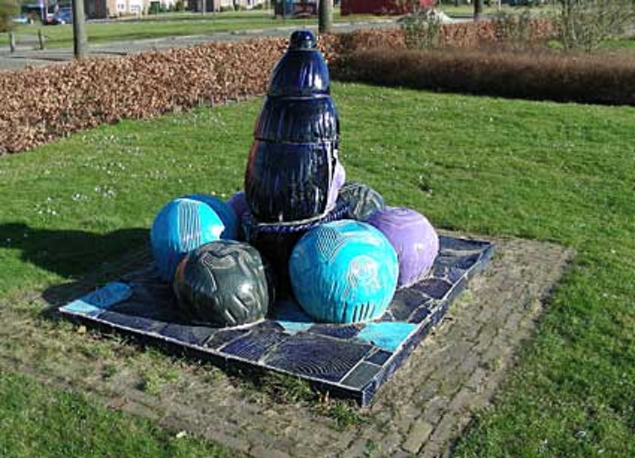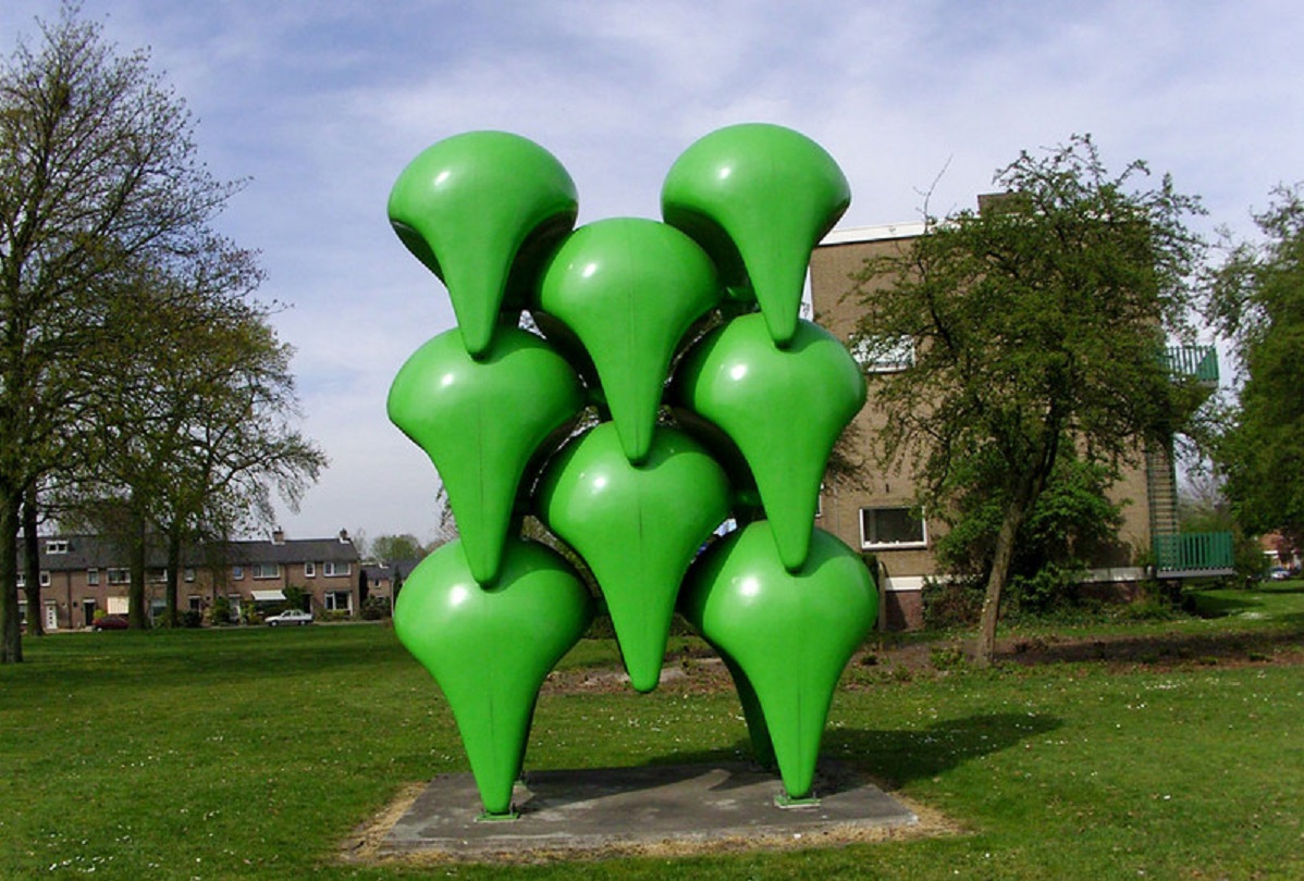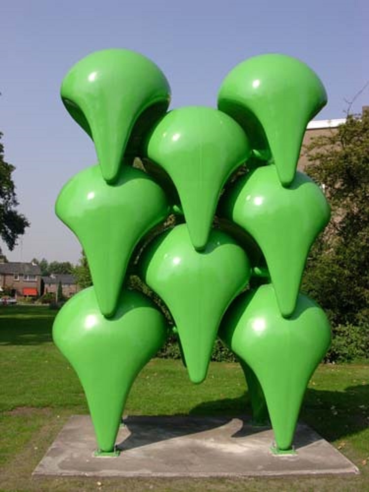 Spoordijkstraat thv de Toekomststraat kunstwerk Stapeling van groene druppelvormen van H. Schuring.