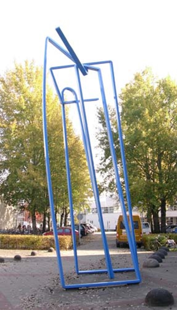 Marijke de Goey is een beeldhouwer en ontwerper die geworteld is in de typisch Nederlandse traditie van geometrische helderheid: lijnen en rechthoeken zijn de primaire vormen in haar werk. Zij heeft veel kunstwerken in de openbare ruimte gerealiseerd maar ontwerpt ook sieraden en interieurs voor treinen van de Nederlandse Spoorwegen. Bijna al haar beelden in de buitenruimte zijn blauw gelakt. Aangezien deze beelden vaak uit ijle lijnen bestaan is belangrijk voor de zichtbaarheid dat ze een kleur hebben die niet in de omgeving voorkomt. In Nederland is zijn de seizoenen sterk wisselend van kleur: de lente is lichtgroen, de zomer geel, de herfst rood en de winter grijs en bruin. Blauw is dan de enige kleur die altijd opvalt. Dat blauw moet wel helder zijn, want minder harde tinten vallen weg tegen de grijsblauwe luchten van Nederland. Voor dit pleintje heeft zij het beeld ’Tangodansers’ ontworpen. Het is 8 meter hoog en bestaat uit twee inelkaar gedraaide ijzeren rechthoeken, gelakt in de heldere kleur blauw die in sommige kringen al ’marijkeblue’ wordt genoemd. bron: http://www.kunstnonstop.nl/collectie/de ... 1StjDpLimw