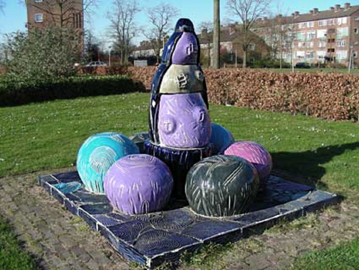 Deze opdracht is gerealiseerd in het kader van het ’KunstZinnig’ project, een serie kunstopdrachten in Enschede geïnitieerd door het Innovatief Centrum voor Kunstenaars (ICK) waarbij beginnende kunstenaars worden ingezet om de kwaliteit van de leefomgeving te verhogen. ’Cocon’ is een samengestelde sculptuur, een stapeling losse, keramische objecten. Alle elementen zijn anders van oppervlakte, verschillend gestructureerd en in wisselende kleuren geglazuurd. Het is speciaal ontworpen voor een vlindertuin. De vormen doen denken aan vlindereieren, een glanzende rups die zich uiteindelijk zal verpoppen. Cocon verenigt twee tegenstrijdige eigenschappen van vrijheid. De ene is het recht op bescherming, het recht op een cocon. Maar het verwijst ook naar het vermogen om te veranderen, te transformeren. Persheng Warzandegan was geruime tijd in haar geboorteland Iran werkzaam als beeldend kunstenaar voordat zij naar Nederland vluchtte en afstudeerde aan de AKI in Enschede. ’Mijn inspiratie haal ik uit mijn omgeving, mijn familie en vrienden, uit de geschiedenis van mijn volk en mijn dromen en uit de muziek.’ bron: http://www.kunstnonstop.nl/collectie/de ... 1hUezpLimw