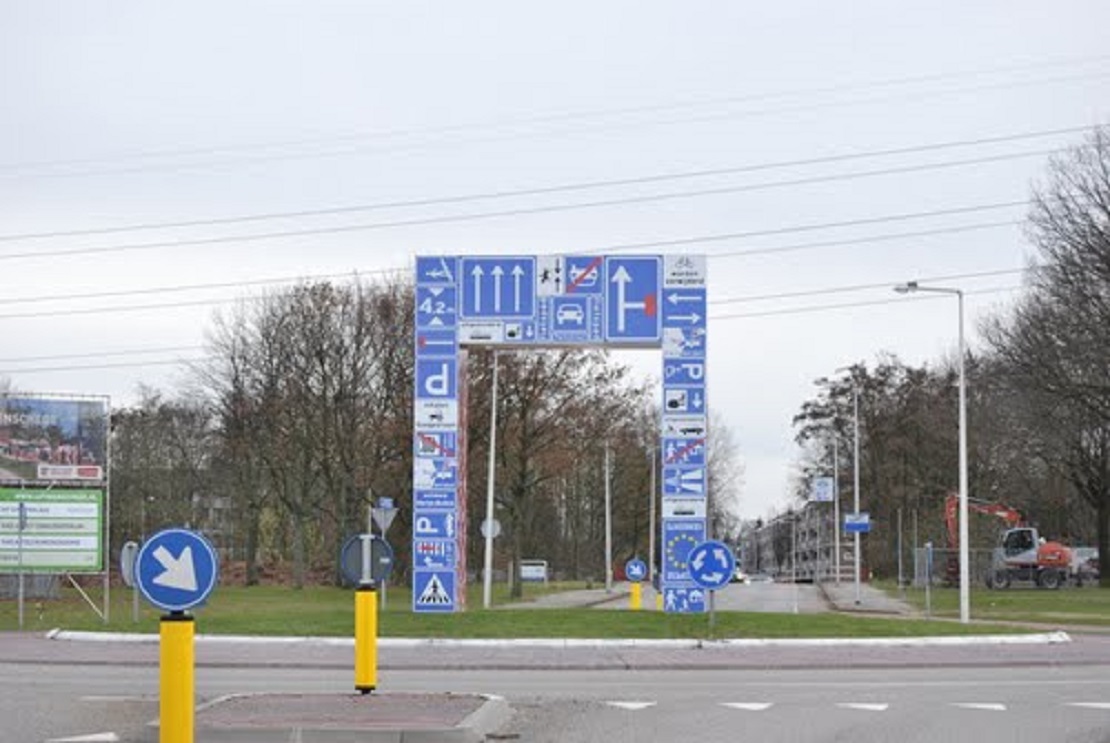 Als gevolg van een herstructurering in het havengebied is een rotonde aangelegd op de kruising van de Hendrik ter Kuilestraat met de Binnenhaven / Rembrandtlaan. Onderdeel van de herstructurering was ook een kunstopdracht. De gemeente Enschede heeft in samenwerking met omwonenden en de Belangenvereniging Ondernemers Havengebied een kunstopdracht geformuleerd. De vraag was om de vitaliteit van de haven zichtbaar te maken en daarbij een relatie te leggen met water, transport, werk en bedrijvigheid. Merijn Bolink heeft als basis van zijn ontwerp de poortgedachte, als markering van de rotonde als overgangsgebied tussen bedrijventerrein en woongebied. Met de Nederlandse overregulering in gedachten heeft Merijn zijn poort uit outer verkeersborden opgetrokken, waarin de kleuren rood en blauw domineren. bron: http://www.kunstnonstop.nl/collectie/de ... 1l1vjpLimw
