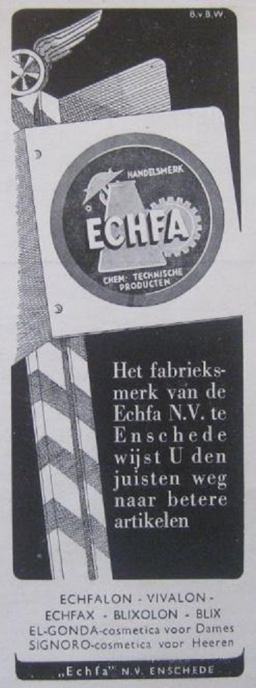 Enkele voorwerpen (o.m. een speldje) en een advertentie van de Echfa N.V., fabriek van wasmiddelen uit Enschede. Deze fabriek stond aan de H. ter Kuilestraat bij de Haven. Volgens onderstaand krantenbericht van 1-4-1957 is daar 61 jaar geleden een grote brand geweest. Ik kan mij dat nog herinneren, want ik ben er toen samen met mijn vader wezen kijken.